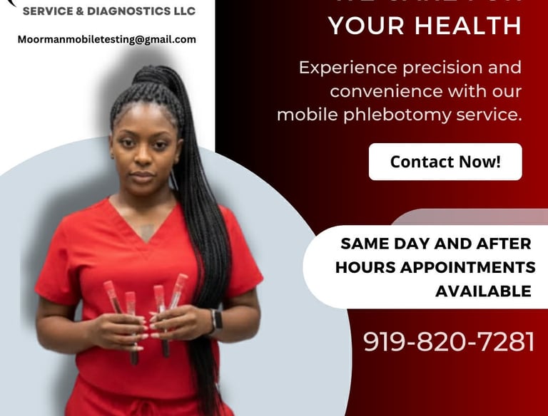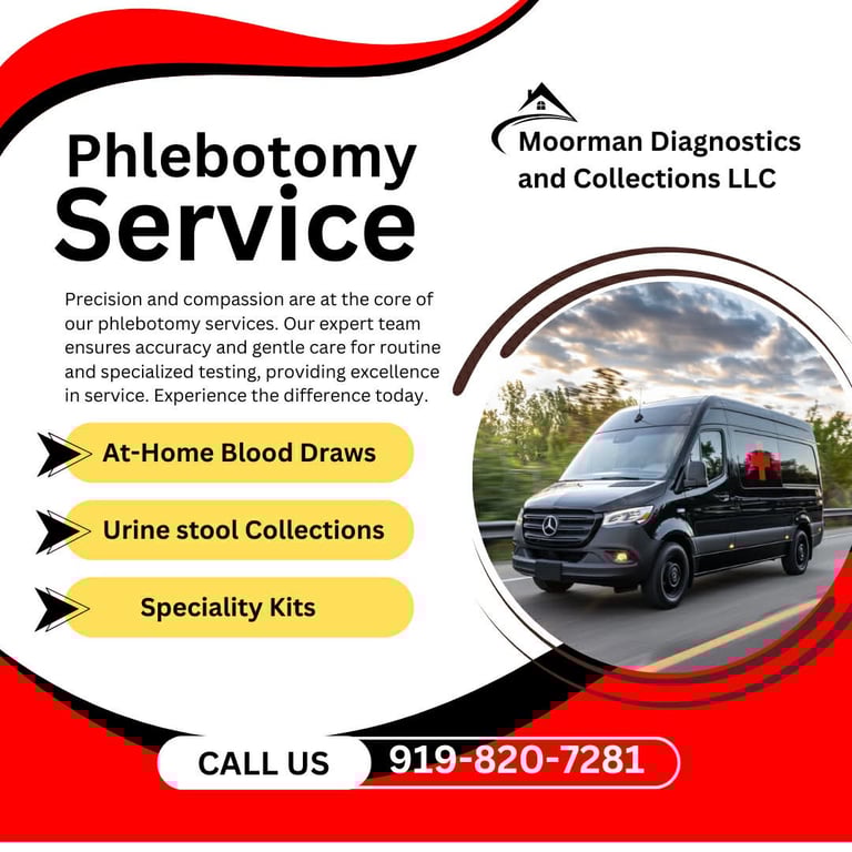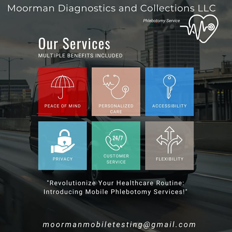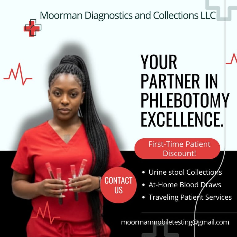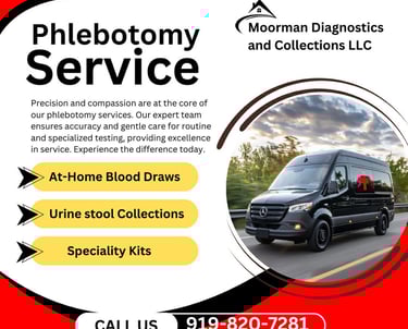 Moorman Diagnostics and Collections LLC stands out by offering fast, flexible, and professional mobile phlebotomy services tailored to each patient's needs. Our team brings accuracy, compassion, and reliability directly to your home, workplace, or facility-ensuring a comfortable and stress-free experience every time.